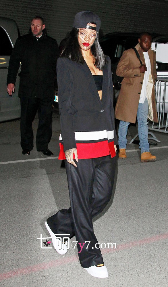 搭配看点:能把西装穿得这么性感的相信只有蕾哈娜了,西装下把平结白色和红色条纹强调十足,将rihanna率性与时尚玩味感展现得淋漓尽致,最吸睛的还是那顶棒球帽下的黑色网纱,十分性感妖娆,极具魅惑力。