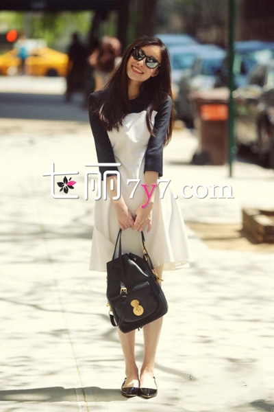 黑白拼色中袖连衣裙,款式简约大方,轻松凸显出倪妮清新自然的气质。精致的剪裁把身材修身的很完美,脚踩黑色平底尖头鞋,背上时尚双肩包,瞬间就多了几分优雅气质,就像一个游学的活泼女生。整个造型透着几分文艺范儿。