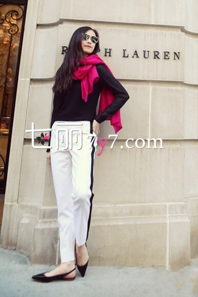 简单的黑色上衣,没有任何的亮点设计但很百搭,是欧美达人非常喜欢的单品,搭配上白色西装长裤,简洁大方的黑白配尽显欧美范儿,配一条玫红色的围巾让搭配更加丰富,气场强大的她驾驭欧美风格完全不在话下。