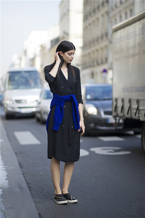 街拍搭配:深V排扣连衣裙+装饰用蓝色毛衣+黑色皮质拉链单鞋