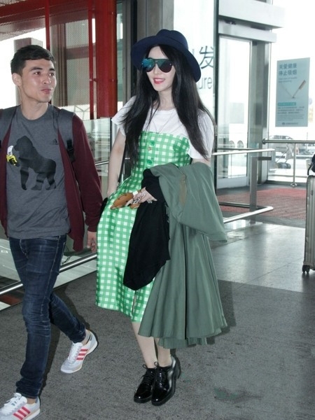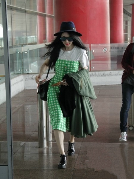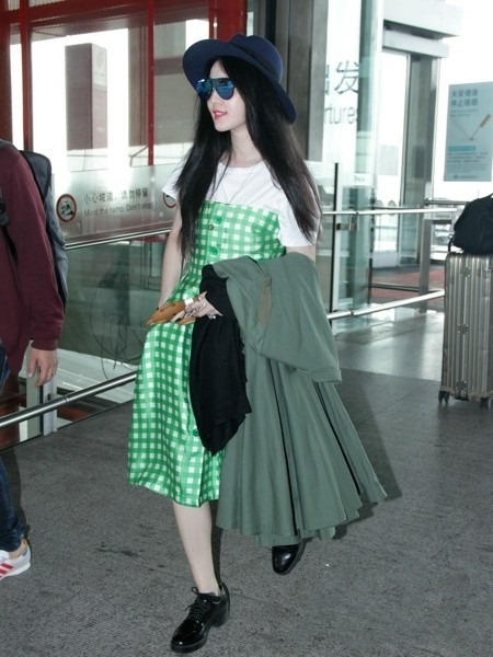 范冰冰身着卜柯文自创品牌Chris By Christopher Bu 2015春夏系列绿色格纹裙亮相机场,清新的格纹裙让范冰冰显得十分甜美俏皮,搭配一款田园气息十足的宽檐帽,以及酷炫的镭射墨镜让范爷更加气场强大,十分抢镜。