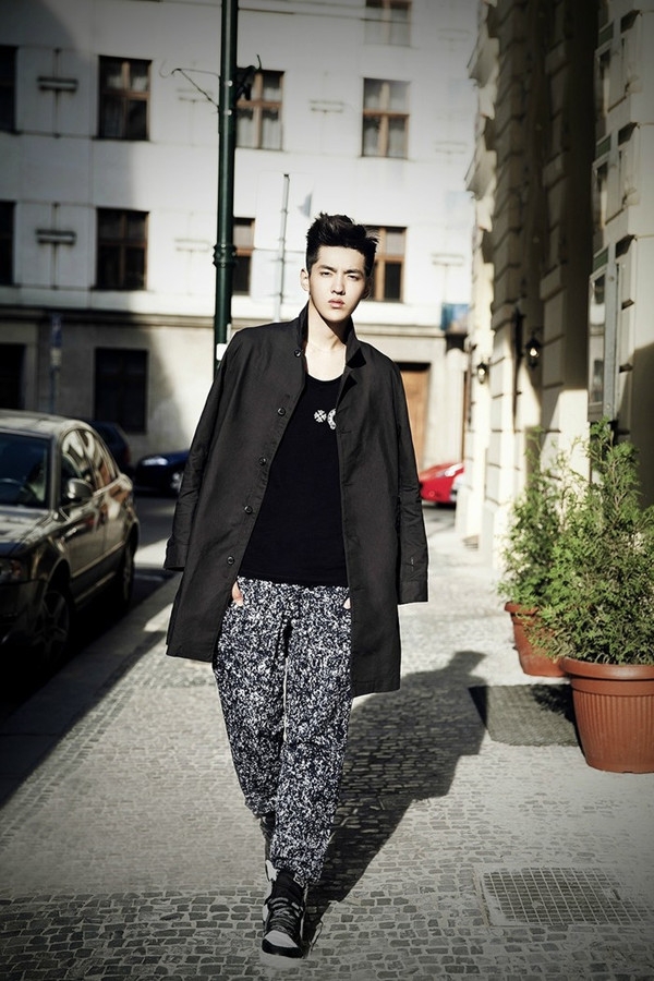 风衣搭配T恤,简约有型,下搭印花长裤很有潮男风范。