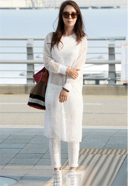 宋智孝身穿一身白,尤其上身穿着能够露出小蛮腰的破格透视装,白色本心搭配透视上款套头衣下半身搭配白色破洞牛仔裤,在鞋子的选择上挑选的白色内增高,相对于高跟鞋而言更加合适,不仅舒适还打到了高跟鞋的作用,增高,让人看上去苗条性感,这次搭配算是懵智比较突破性的装扮,全白造型亮相的她尽展清新气质。