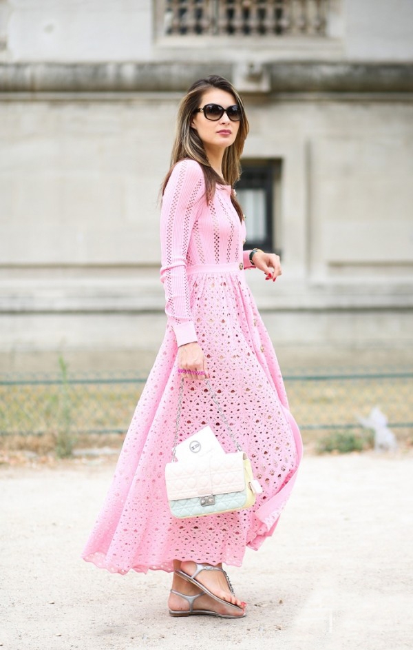 粉色的镂空连衣裙略微性格又不失童贞的感觉,女人和小女生的完美结合。