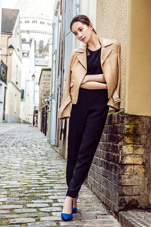黑色连体裤再配上皮外套,再加上一双蓝色的尖头高跟,帅气的女人味。