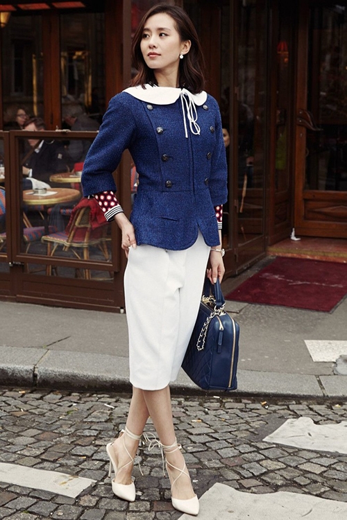 蓝色的排扣西装配上白色的香槟裙,再带上系带的尖头高跟。我是职场的女强人,谁都不要想在我的前路阻拦。