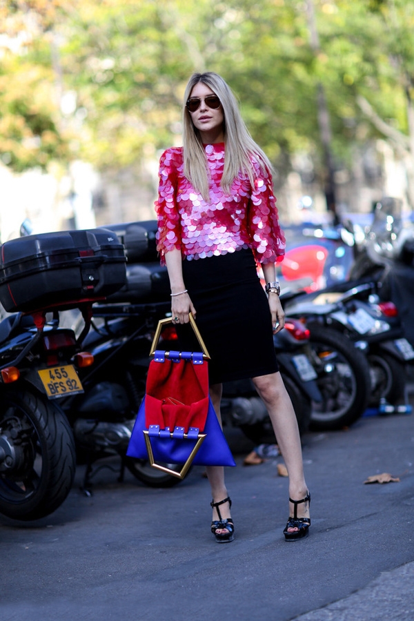 亮片是典型的七十年代产物,比起这样的大亮片那时更加喜欢size更小的亮片,但是想做一个合格的Vintage女郎你一定少不了它,闪闪发光的粉色亮片简直太美太妖娆。不想全身都过于浮夸,选择沉稳的下身简直是完美的搭配。