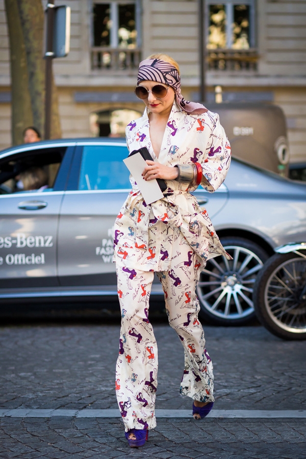 凯瑟琳的造型一直是时装界不变的话题,宽肩的套装远看摩登范十足,近看每个图案都是性感的女郎。从配色上就就很简单干净,秉着时装界的三色规矩,搭配上同色系的紫色高跟和头巾,这个女人不只是时装周浮夸,日常也夺目得不行。