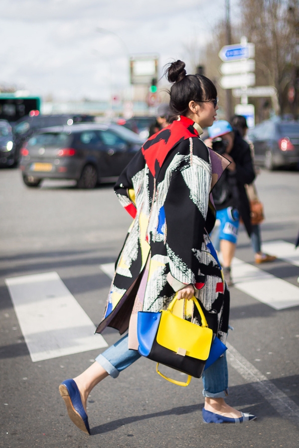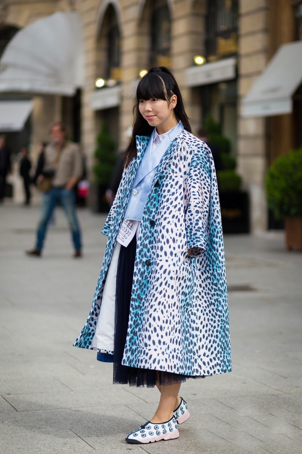 这个小个子的亚洲博主,近年来频频在镜头中出现。这身豹纹绝对是浮夸风的经典代表,廓形的大衣搭以渐变的蓝色,再加上一双印花鞋。虽然印花元素繁复,但却也找了不同的方法将他们融合到了一起。