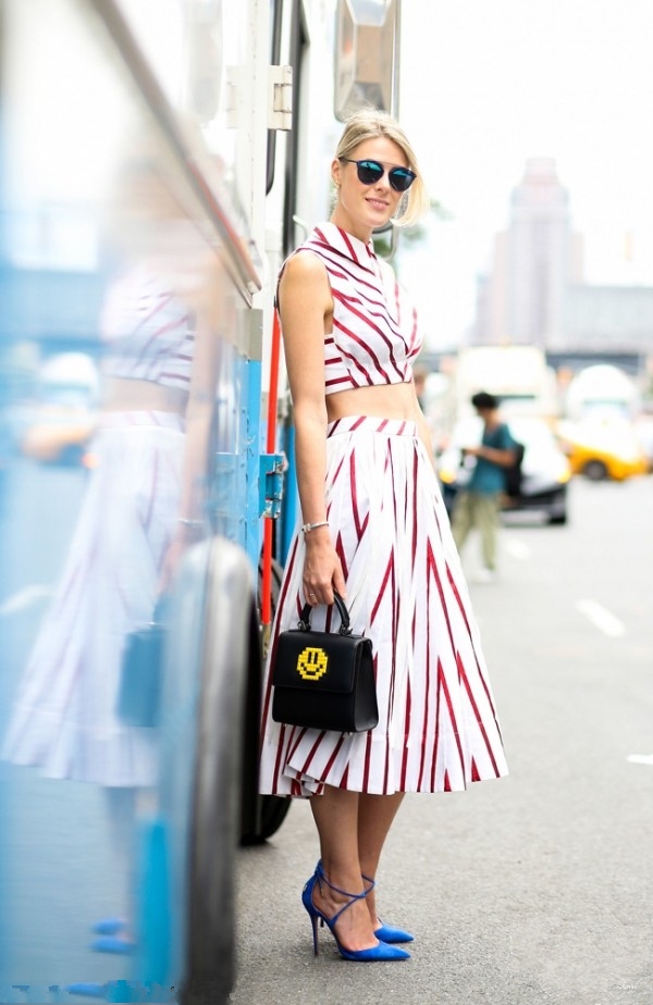 早秋以一身清凉的装扮出街绝对是明智的,像这样选择一款短款上衣,搭配上美美的高腰裙,显得既性感,又高挑,几何排列的条纹图案配上白色的底色将服装辉映得摩登潮流,出门还不忘带一款卡通图案的简约手提包来增加可爱度。