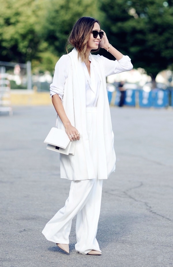 利用白色做层次的搭配丝毫不会觉得呆板,反而透漏着简约大气,不过还得注意款式的选择,如果这里把长款薄外套换成短款,或者内搭换成圆领就不会是这种感觉了。