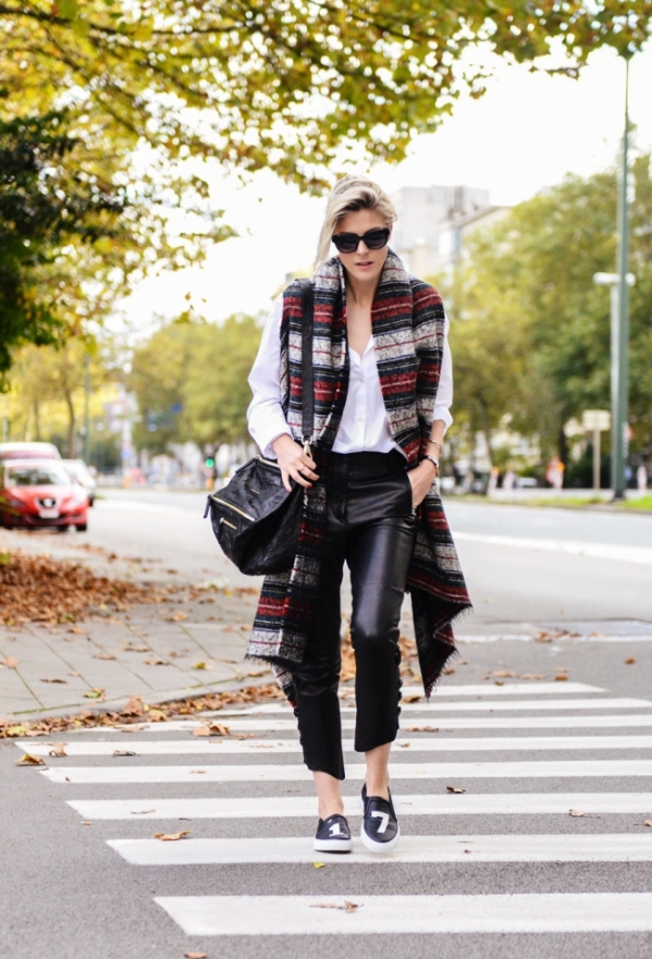 黑色皮裤搭配白色衬衫打造出流行的中性风格,几何剪裁的拼色条纹围巾随心所欲的搭在肩上,简约大气,前卫时尚。