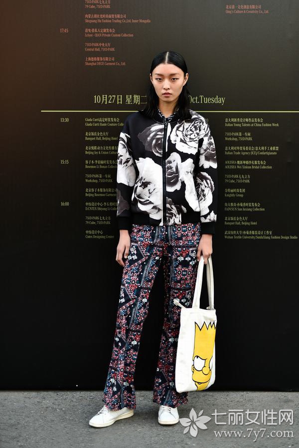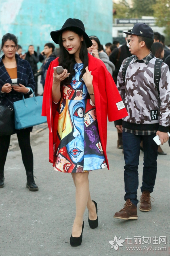 看惯了国际街拍的观众,不如放送一下疲惫的神经,来感受一下本国的时尚魅力吧。北京的街拍还是较符合本国穿衣口味的,看图片中的达人,身穿复古漫画印花连衣裙,突显个性,彰显时尚。外搭中国红的半袖呢子大衣,衬托出女性苗条身姿,而极具渲染力的色彩,在保证国际范的同时,也感受到浓浓的中国情。