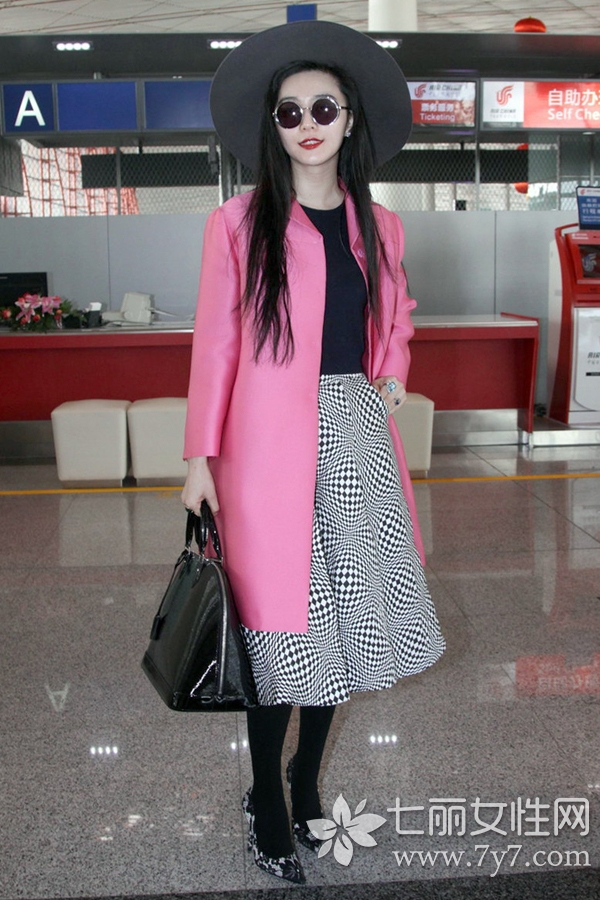 这张街拍图片中,范冰冰身穿的一件粉红色一字裙,虽然阔形的空气感,没有很直接修饰范冰冰的身材,但大方利落的剪裁,配上简洁明了的印花图案,也极具个性时尚。印花挎包在此时也是赋予了几分俏皮感。