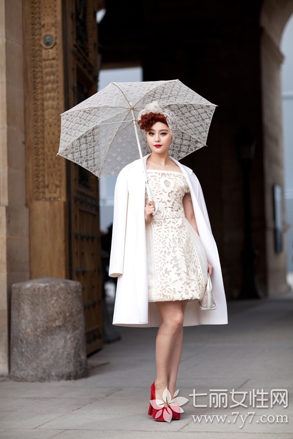 白色的拼接镂空裙装,流露出高贵优雅的贵妇人气质,肩披白色呢大衣外套,不仅女王味十足,而且清纯度也是爆表,最后一双大红色高跟鞋不仅为整体提供亮点,也多了几分成熟女人的妩媚风情。