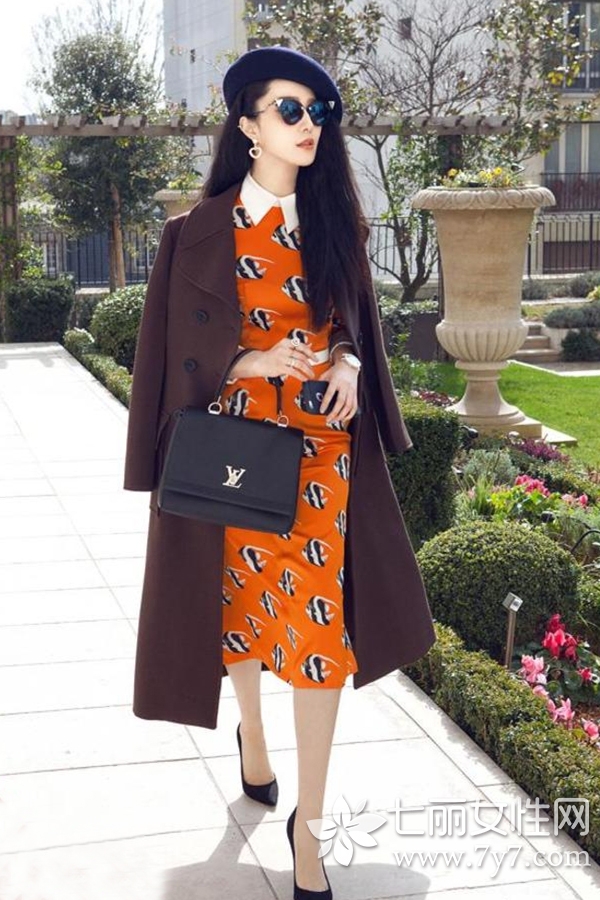 图片中橙黄色一字裙勾勒出范冰冰修长苗条的身姿,鲜艳的色彩也显得颇具活力,内搭白色衬衫,修饰颈部的同时,提升了整体的气质。外披上廓形呢衣外套,大气中不失优雅迷人,斜戴的贝雷帽和精致手提包,让整体在不经意间流露出名媛气质。