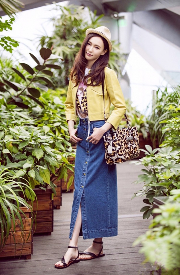 休闲的小西装勾勒出唐嫣的娇小身材,搭配上前排扣牛仔半长裙,尽显气质,又不失整洁干练。狂野的时尚豹纹单肩包,跨在腰间,流露着狂野不羁,与印花T恤交相辉映,真是非常巧妙的搭配。