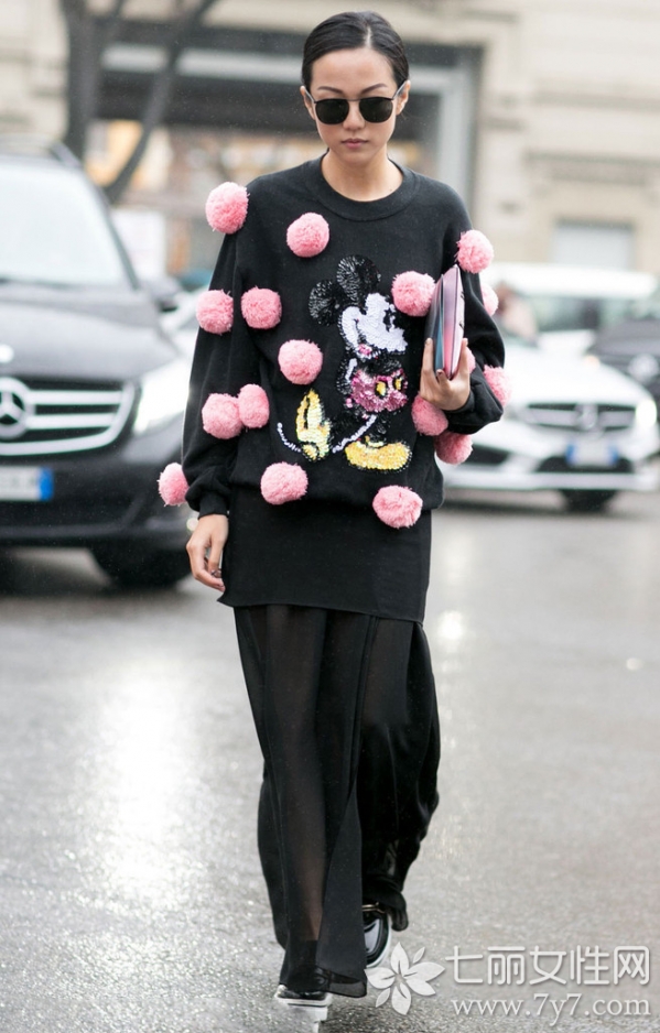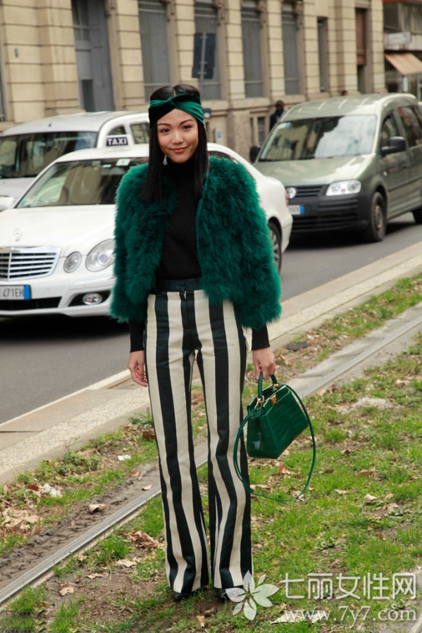何穗最新街拍,灰色毛衣+墨绿色光泽感半裙,文艺慵懒,少女感十足。马海毛毛衣来自H&M,手提包和粉色毛拖鞋均来自Gucci,半裙来自Tibi 2016