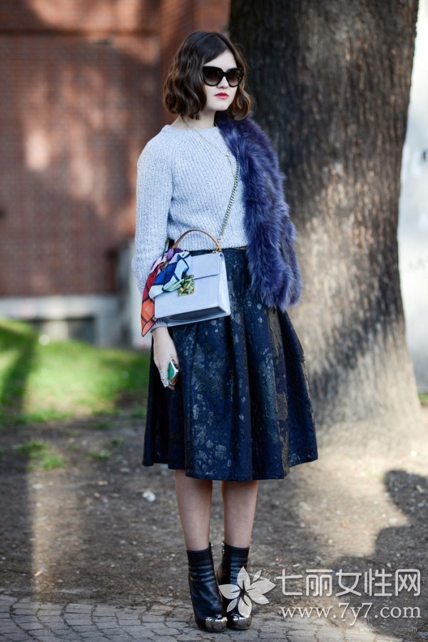 裙子的款式选择也会影响到整体的时尚度。看图中粉蓝毛衣与白色半裙的搭配,下开叉的设计让整体时髦度提高了几个阶,而且女性的性感优雅也随之而来。