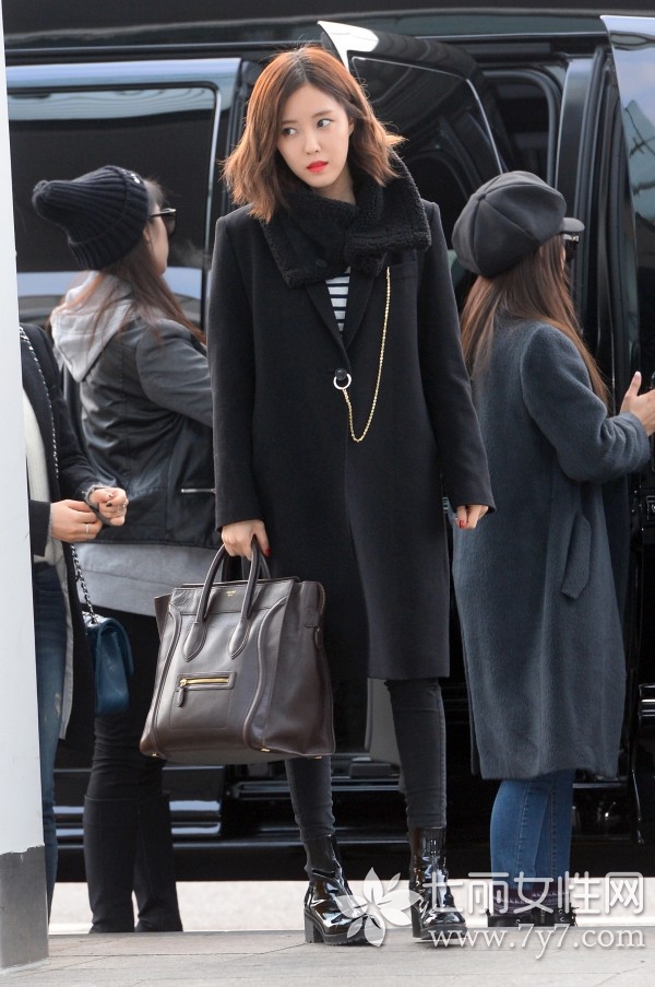时尚看点:孝敏是韩国Tara女团组合成员之一,作为队中的颜值担当,也是典型的韩范美女。黑色长款大衣是韩国欧尼最爱的经典配色,时尚百搭,关键是特有范,与铅笔裤的组合,是转走臃肿感的最好搭配。而搭配上黑色小皮鞋。大号手提包,也是韩女星最爱的搭配单品,与身型形成的反差,也能带来别样的视觉感受。