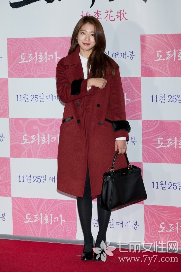 时尚看点:韩国女神朴信慧是清纯类型的代表人物。图中身穿枣红色呢大衣,尽显优雅气质,而下装则选择用黑色丝袜营造腿部纤细,性感度也加倍不少。