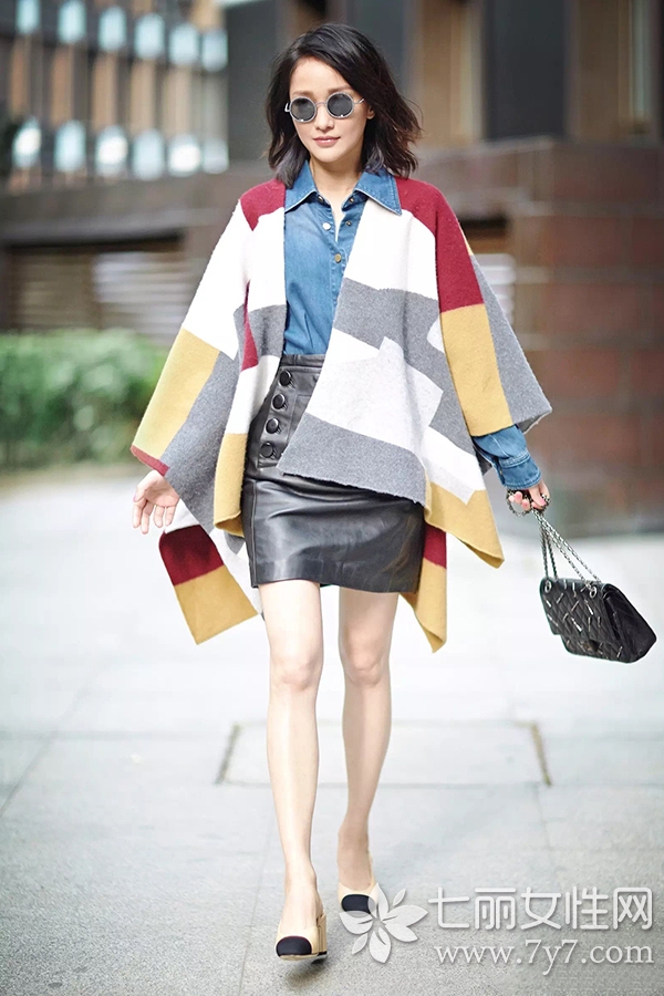 LOOK1:斗篷+牛仔衬衫+包臀皮裙+香奈儿拼色鞋