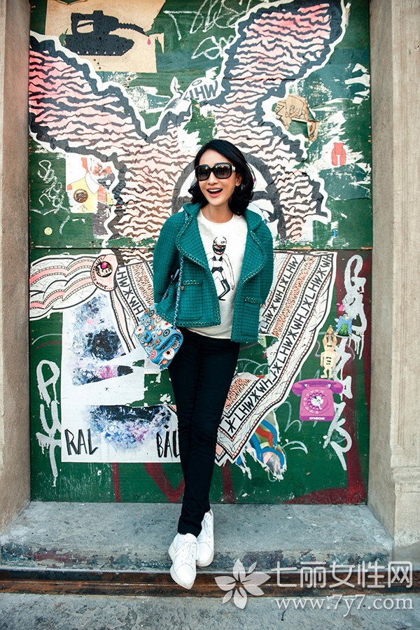 LOOK4:香奈儿绿色格纹外套+印花卫衣+黑色小脚裤+白色球鞋