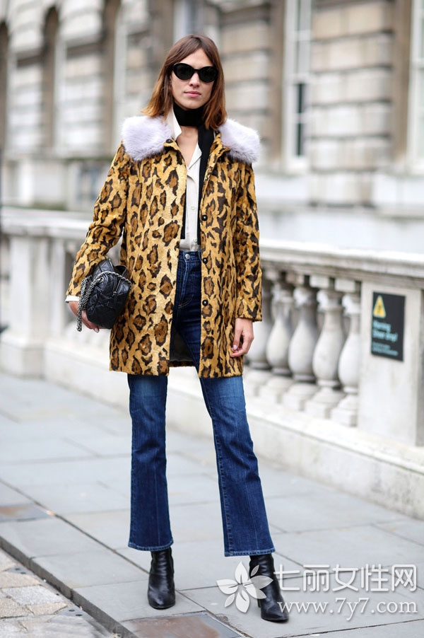 皮草领口的拼接与豹纹的设计组合,让大衣看上去满是奢华,搭配休闲的高腰喇叭裤修饰出修长腿部,添了几分别样魅力,女王范爆棚!