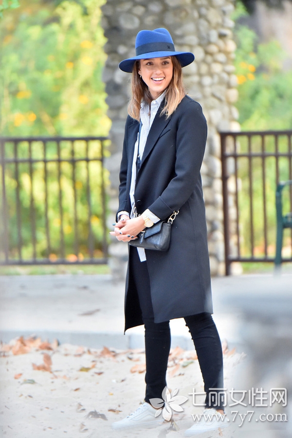 西装领口大衣加上深灰的着色,略显低调和中性化,内搭白色衬衫整洁不失清爽,又赋予了女生别样的气质。而蓝色宽檐帽则成了整体点睛之笔,让时尚度也提高了好几格。