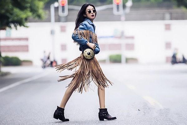 流苏一直是时髦达人最爱的潮流元素之一,与今年正热的麂皮面料相结合则更具时尚风韵。带上极具抓马气质的迷你链条包与朋克风十足的短靴,让你轻松成为街头焦点。