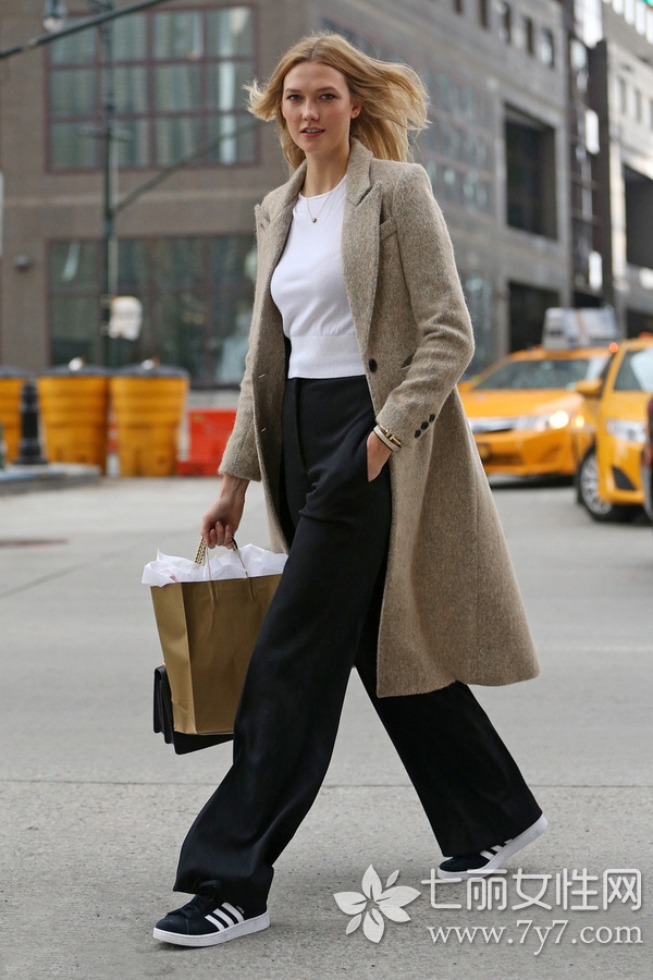 灰色大衣是卡莉劳伦斯的最爱,她不仅穿得好看,搭配也很有心机。图中用短款上衣与阔腿裤的内搭组合,腿部已经长到没边,而阔腿裤相较于牛仔裤,则多了几分简约范,看上去颇为大方。
