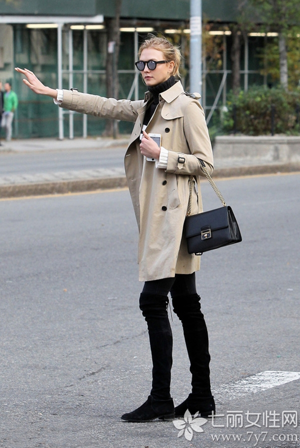 浅杏色中长款风衣,将卡莉劳伦斯的肤色衬托得极为好看,满是青春洋溢,当然,卡莉劳伦斯还是个在读大学的菇凉,当然有资格任性,搭配长靴的style得俘获多少学弟学长的视线啊!
