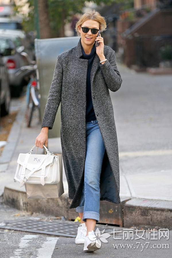 麻灰色大衣作为当下流行的灰色系,爱大衣的卡莉劳伦斯当然也不会错过。图中的一件麻灰色大衣被演绎得颇感活力,不穿高跟鞋的LOOK依然魅力爆棚。