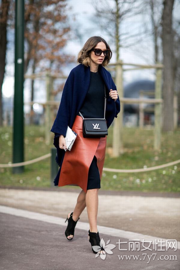 皮质的开叉半裙,多了些复古魅力,内搭长裤,也是非常流行的搭配方式哦!