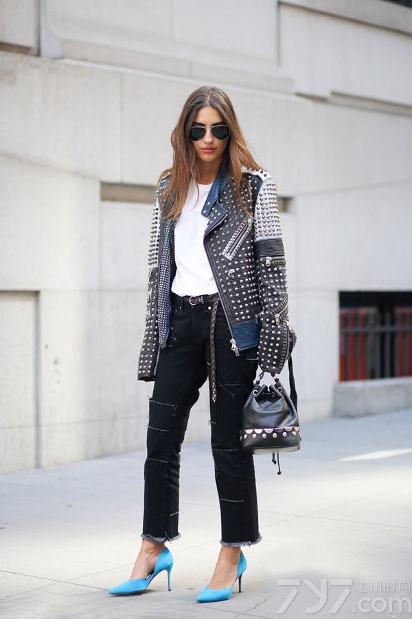 机车皮衣绝对是欧美潮人街头必备单品,不管男女都十分喜爱。除了街头感强外,由女潮人演绎总是透着别样的魅力。