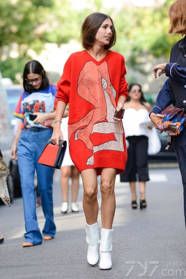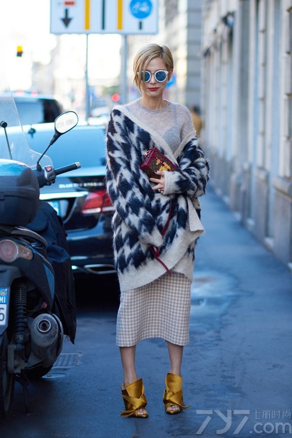何穗最新街拍,灰色毛衣+墨绿色光泽感半裙,文艺慵懒,少女感十足。马海毛毛衣来自H&M,手提包和粉色毛拖鞋均来自Gucci,半裙来自Tibi 2016