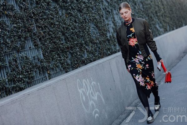 飞行夹克配上印花长裙,给人一种和谐的反差美感。