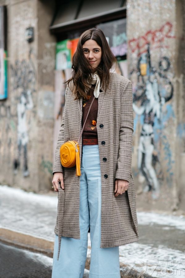 柏林街拍的时装风格更注重款式的简约,大方和品质感,达人喜爱用低调沉稳的色彩去表现个人魅力,持久而深层。图中用廓形剪裁的细格纹大衣配上浅蓝阔腿裤,颜色低调却充满质感,橙色的gucci包包则适时的起到点亮整体的作用。