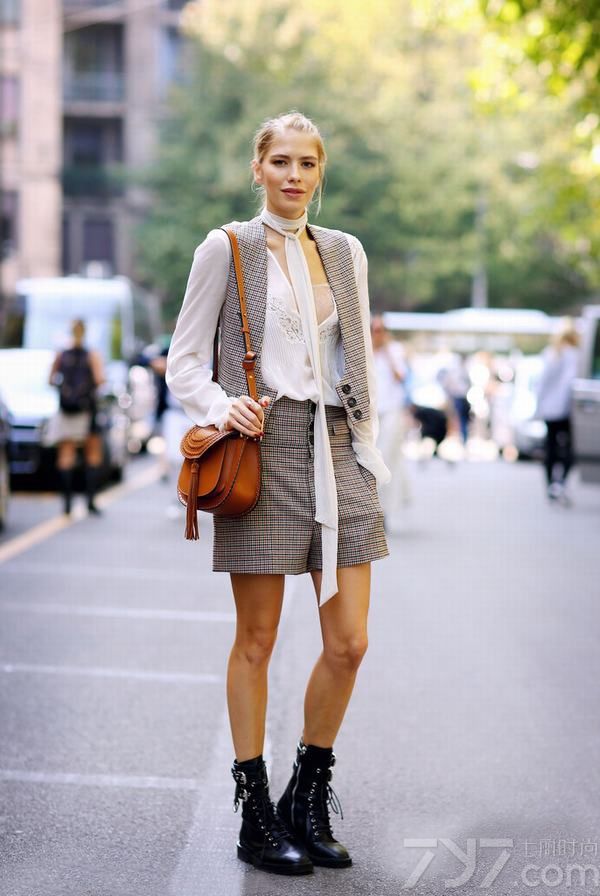 眼前虽然还是寒潮,但年后的不久也该慢慢回暖了,春装的搭配法可要提前收好才能稳操胜券哦!Elena Perminova这一套充斥英伦风格的套装,配上帅酷马丁靴,简直摩登范十足,而复古单肩包,则又将整体赋予几分别样气息,吸睛度倍增。出街配一条丝巾,看似不御寒,却也能丰富整体造型,平添几分气质哦!