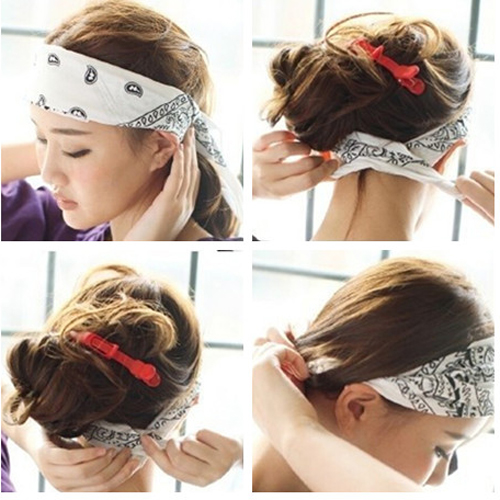 用梳子把头发梳顺,用巾做发带,叠好的发带包裹住额头。