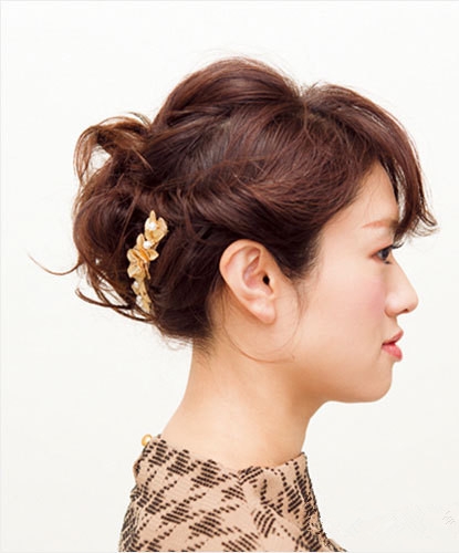 时尚看点:这款简单的韩式盘发发型,给人十足的高贵与优雅气质,配上一款蓬松而带点凌乱感的卷翘刘海,十分具有个性与设计感,加上金色花儿珍珠发夹的点缀,瞬间让整个盘发发型都充满了迷人气质。