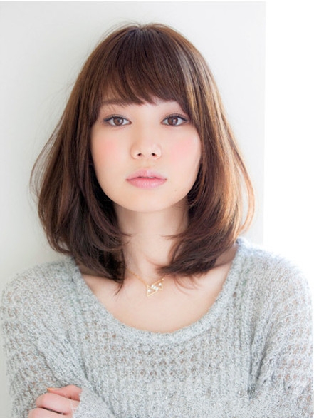 时尚看点:给人清纯气息的一款齐肩中长发发型,显尽十足迷人的清新范儿,微微内扣烫卷的发尾衬托出女生甜美的小脸,配上一款修颜斜刘海后更是完美迷人。