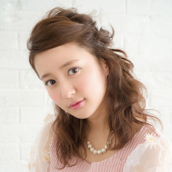 时尚看点:中长卷发半公主头扎发发型看起十分的甜美迷人,将蓬松的刘海固定在脑后,可以轻松展露出白皙而清爽的额头,采取半扎发公主头搭配卷发的效果,满满都张扬着甜甜的公主气质。