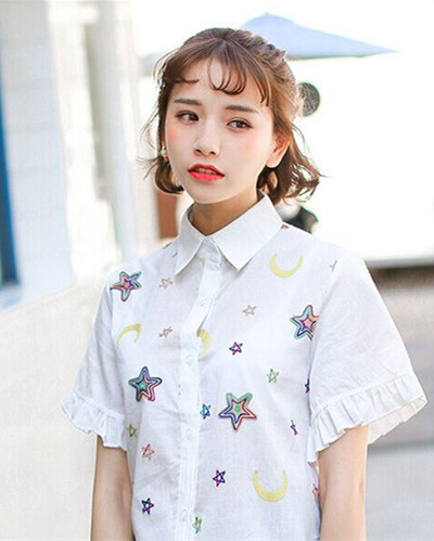 时尚看点:短发半扎起来的这款韩式短发发型,散发出几分甜美公主范儿,烫卷的发尾+烫卷的空气刘海的设计,无不让造型充满着十足的清新萝莉风。