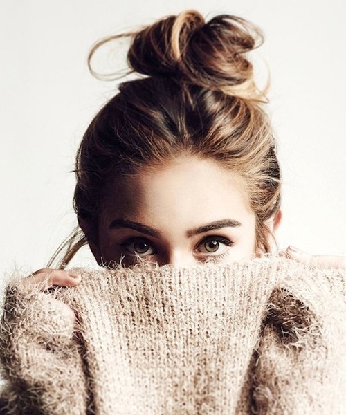 时尚看点:这款长卷发扎成蓬松感的花苞头发型,彰显出十足的清新甜美范儿哦,高耸扎发设计绝对给人带来的清爽的效果,棕色的发色让这款花苞头更显时髦感。