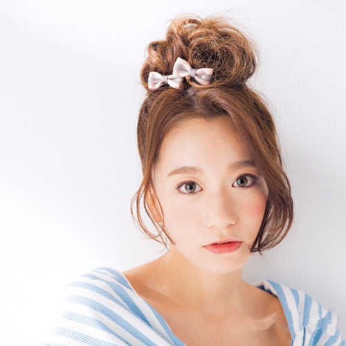 时尚看点:这款高耸的花苞头搭配蝴蝶结的造型展现出甜美减龄的气质,配上一款修颜显瘦的侧分长刘海,轻松让女生看起更显惹人爱,高高绑起花苞头的设计张扬出夏日的清爽与自然感。