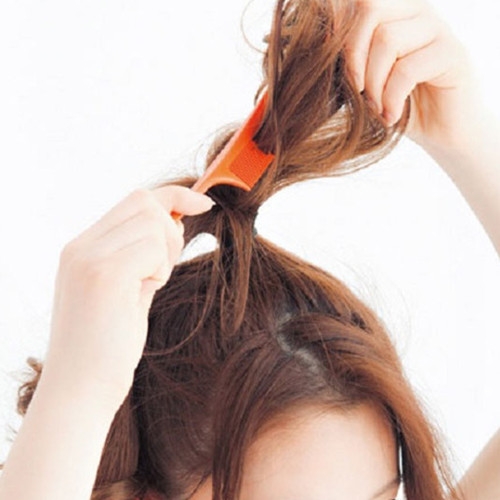 将头发绑成高耸的马尾后打毛发尾。