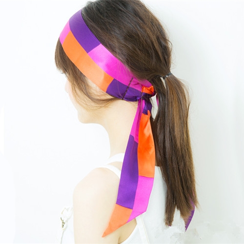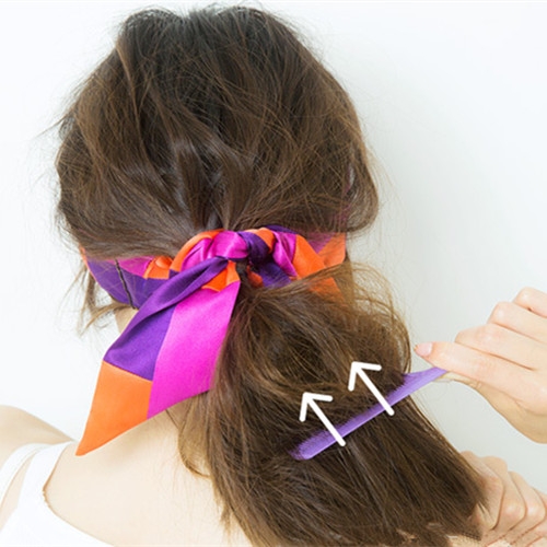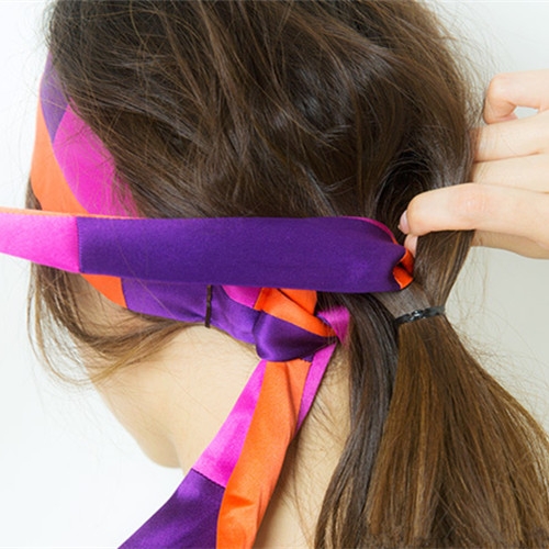 发带从马尾中间穿过,与另一侧发带绑成蝴蝶结状。