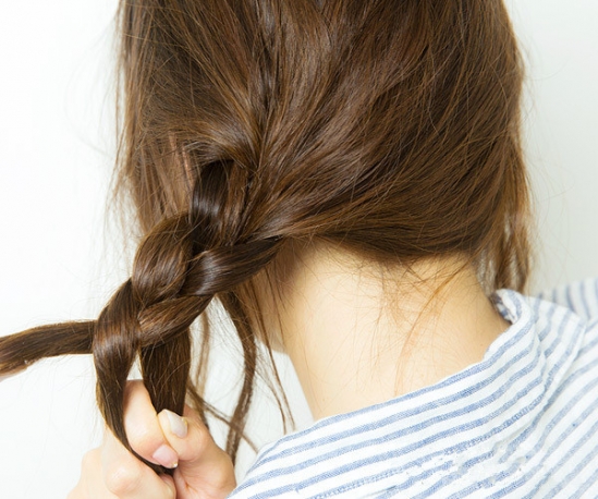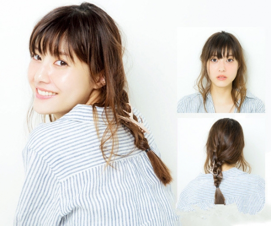 之后将头发在侧边编三股辫然后用黑色橡皮筋将头发扎住,留下一点小马尾,最后将别致的发夹戴上即可。