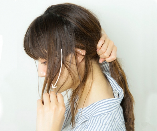 将头发集中之后再用手轻轻将侧边头发拨出来,让马尾显得更加自然。